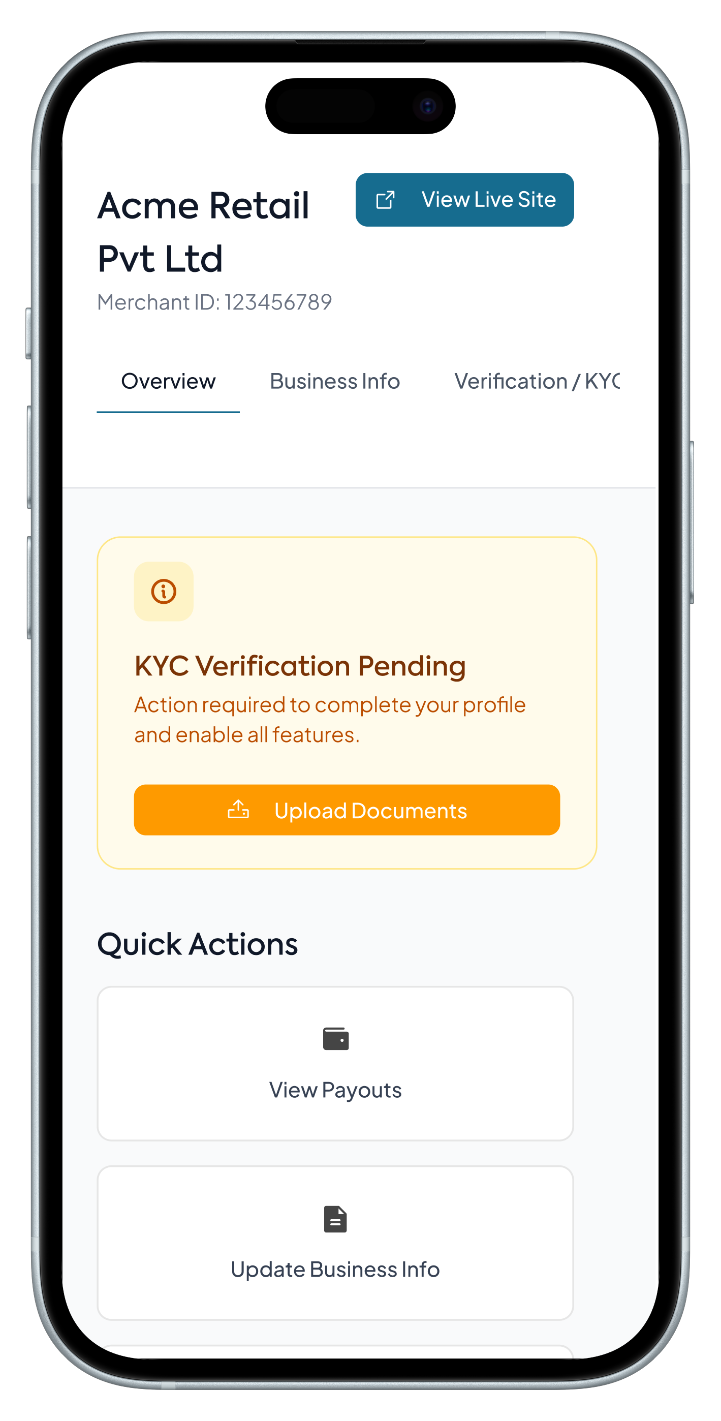 Realistically, the business owner isn't the one logging in to upload documents—their staff is. And they are usually in a rush. I realized a standard "Edit Profile" form was too passive for them; they don't want to browse settings, they want to unblock payments. So, I designed this section to look less like a form and more like a status report. It allows the team to instantly spot what’s broken (like an expired document) and fix it immediately, ensuring the system keeps running without the CEO ever needing to get involved.